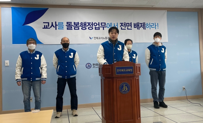 전라북도교사노동조합(위원장 정재석·이하 전북교사노조)는 13일 오전 전라북도교육청 브리핑실에서 기자회견을 열고 돌봄업무를 교사의 업무분장에서 배제하라 촉구했다.
