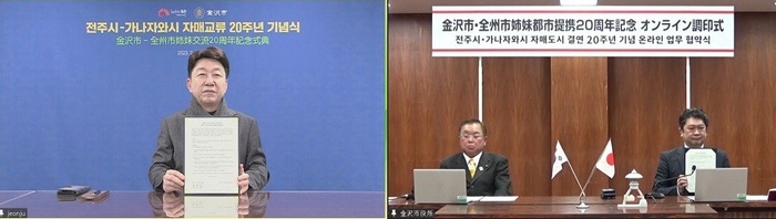 전주시와 가나자와시는 21일 우범기 전주시장과 무라야마 타카시 가나자와시장, 미야자키 마사토 가나자와시의회 의장 등 양 도시 관계자들이 참석한 가운데 ‘자매교류 20주년 온라인 기념식’을 개최했다.