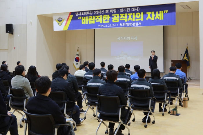 부안해양경찰서(서장 성기주)는 22일 오전 4층 대강당에서 오랫동안 외교 업무 분야 공직에 몸담은 김재신 前 독일·필리핀 대사를 초청해 바람직한 공직자의 자세 등에 대한 내용의 ‘명사 특강’을 개최했다고 밝혔다.