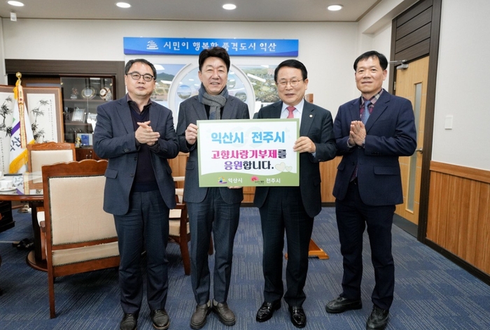 우범기 전주시장과 정헌율 익산시장은 24일 익산시청에서 건전한 기부문화 활성화와 교류·협력 사업의 추진을 약속하면서 상호 지역에 고향사랑기부금을 전달했다.