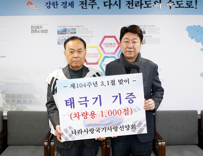 나라사랑국기사랑선양회(회장 조형식)가 제104주년 3.1절을 기념해 전주시에 태극기를 기증했다.