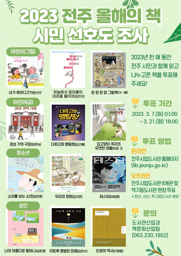 시민 선호도 조사는 전주시립도서관 누리집(lib.jeonju.go.kr) 또는 휴관 중인 도서관을 제외한 9개 시립도서관과 시청 로비 책기둥도서관에서 참여할 수 있으며, 시는 후보도서 중 최다 득표를 받은 부문별 1권씩 총 4권을 ‘2023 전주 올해의 책’으로 최종 선정할 계획이다.