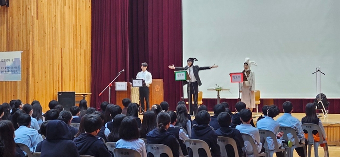 전주시평생학습관(관장 권인숙)은 26일 완주 화산중학교 강당에서 110여 명의 학생들과 함께 극단 아트컴퍼니두루가 준비한 연극 ‘종의기원’을 함께 관람했다.