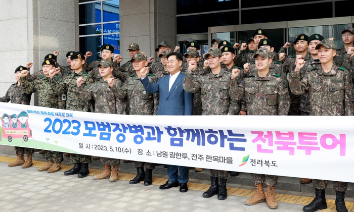 전북도는 도내 군부대에서 복무중인 타 지역 출신 국군 장병들에게 전북의 문화와 역사 등을 체득할 수 있는 문화관광탐방을 실시했다. 도는 10일 35사단 등 도내 5개 군부대에서 복무하고 있는 타 지역 국군장병 40명을 대상으로 전북투어를 실시했다고 밝혔다. 이번 전북 투어는 올해 처음 실시하는데 타 지역 장병들이 전북지역의 자연경관과 문화유산, 그리고 볼거리 등을 체험함으로써 전북도의 이미지를 높이고 관·군 유대 강화를 통해 통합방위태세를 확립하기 위해 마련됐다. 이번 투어는 전문해설사의 안내에 따라 한옥마을, 광한루원 등을 탐방하면서 전북 문화유산 등을 이해하는 프로그램으로 진행됐다. 이날 김관영 지사와 오혁재 35사단장 등은 투어 시작 전 도청 광장에서 장병들의 노고를 치하하는 자리를 별도로 마련해 격려했다. 김 지사는 “이번 모범장병 투어가 타 지역 장병에게 전북의 문화와 역사를 이해하는 현장체험의 기회가 되기를 바란다”며 “앞으로 더 많은 장병들이 참여할 수 있도록 확대 시행하겠다”고 말했다.