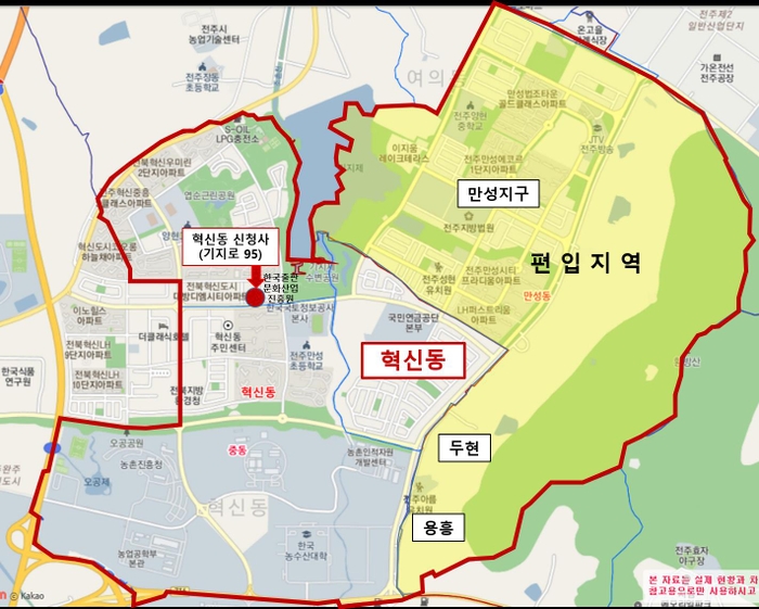 전주시 덕진구 여의동에 속했던 만성지구와 인근 두현·용흥마을이 오는 6월 30일부터는 혁신동으로 편입된다.