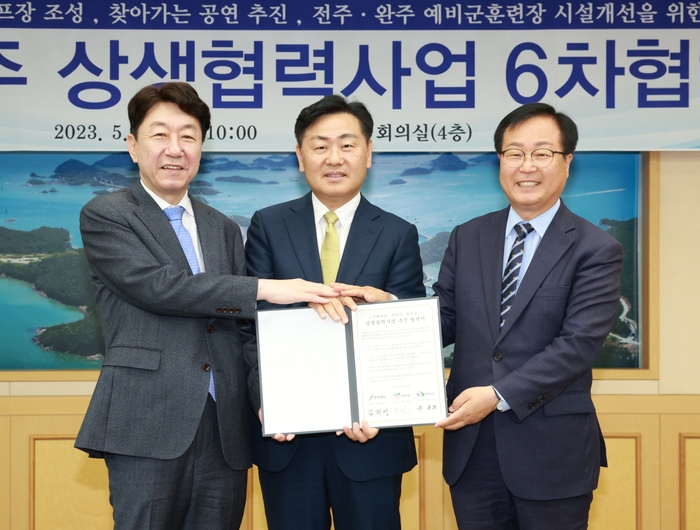 전북도와 전주시, 완주군이 공동 추진하고 있는 상생협력사업이 지속적으로 발굴되고 있는 가운데 지난 4월 5차 협약 후 한달만에 세 가지 사업을 추가 추진키로 했다. 도는 16일 도청 회의실에서 김관영 도지사를 비롯해 우범기 전주시장과 유희태 완주군수가 참석한 가운데 ‘전주·완주 상생협력사업 추진 6차 협약식’을 가졌다고 밝혔다. 이번에 추진하기로 한 사업은 먼저 ‘완주·전주 파크골프장 조성 협력사업으로 최근 급증한 파크골프 이용자 수요에 맞춰 파크골프장 조성에 도-전주-완주가 적극 협력하기로 했다. 전주 파크골프장 시설 부족에 따라 많은 전주시민이 완주군 파크 골프장을 이용하고 있으며 파크골프장 추가 조성을 통해 이용자들 수요를 충족시킬 수 있을 것으로 기대된다. ‘찾아가는 공연 추진’ 협력사업으로는 전주시립예술단의 고품격 맞춤 공연을 통해 완주군민과의 문화예술 교류로 화합과 소통의 지역 문화예술 공감대 형성에 상호 협력기반을 마련하게 됐다. 또한 전주시·완주군 예비군 대원들의 편익 증진을 위해 매년 만 여명의 예비군 대원들이 사용하고 있는 전주·완주 예비군훈련장 시설개선사업을 공동 추진하기로 했다. 그 동안 예비군 훈련장 주차장이 비포장되어 훈련 대원들의 불편함이 있었으며 시설개선사업을 통해 불편함이 해소될 것으로 기대된다. 김관영 도지사는 “전주-완주가 상생의 길을 걸어가는데 협력해주신 양 단체장님께 감사드린다”며 “지금처럼 사업의 경중을 가리지 않고 오직 주민 편익 차원에서 사업을 추진해 달라”고 말했다. /김관춘 기자