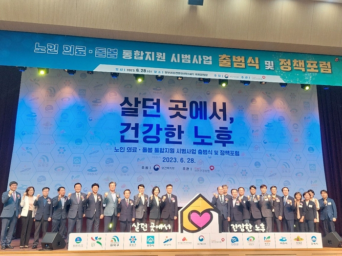 ‘노인 의료-돌봄 통합지원 시범사업 출범식’이 28일 김헌주 보건복지부 기획조정실장과 김인태 전주부시장을 비롯한 12개 시범사업 선정 지자체 관계자, 건강보험공단 관계자 등 150여 명이 참여한 가운데 정부 세종컨벤션센터에서 열렸다.