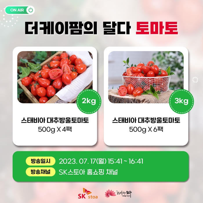시는 ㈜더케이팜의 ‘스테비아 대추 방울토마토’가 오는 17일 오후 3시 41분부터 약 한 시간 동안 SK스토아 홈쇼핑 채널을 통해 판매된다고 14일 밝혔다.