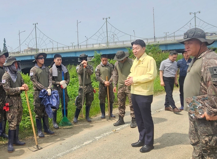 우범기 전주시장이 폭우로 전주천·삼천에 쌓인 각종 쓰레기를 치우기 위해 구슬땀을 흘리는 군 장병들을 찾아가 감사함을 표했다.