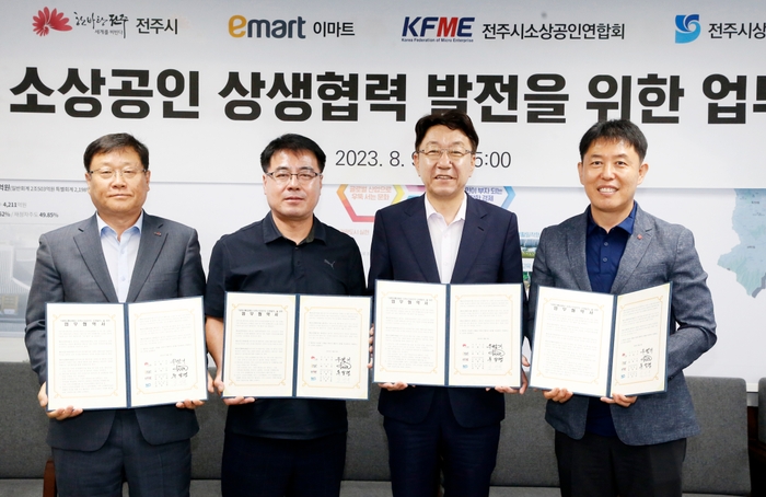 시는 9일 전주시장실에서 우범기 전주시장과 최학묵 ㈜이마트 전주점 지점장, 유장명 전주시 소상공인연합회장, 심성욱 전주시상인연합회장 등이 참석한 가운데 ‘대형유통업체와 지역 소상공인의 동반성장을 위한 지역상생 협력사업 업무협약’을 체결했다.