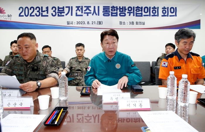 전주시는 21일 시청 3층 대회의실에서 ‘2023년 3분기 통합방위협의회’를 열고 통합방위계획에 따른 유관기관과의 협조방안 등을 논의했다.