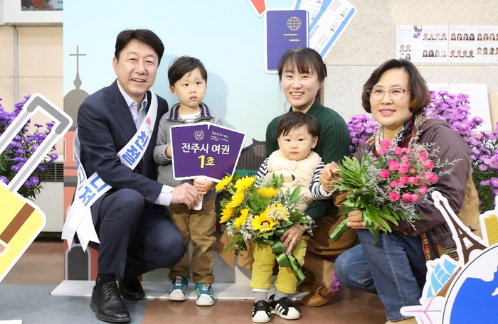 우범기 전주시장은 이날 민원실을 찾아 제1호 여권 신청자인 송 씨 가족에게 축하 꽃다발과 전주시자원봉사센터에서 제공한 환경 친화 여행용품을 담은 기념품을 전달했다.