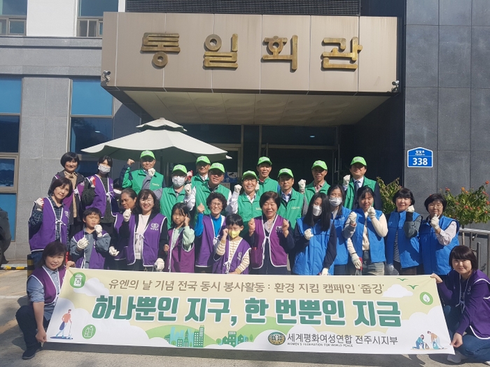 세계평화여성연합 전주시지부(공동회장 박서현, 지모또유끼꼬, 이하 여성연합)는 제78주년 유엔의 날을 기념한 제6차 전국 동시 봉사활동의 일환으로 29일(일)오후 모래네시장 인근에서 소속회원등 30여명이 참여한 가운데, 조깅을 하면서 쓰레기를 줍는 환경 지킴 캠페인 ‘줍깅’을 실시했다.