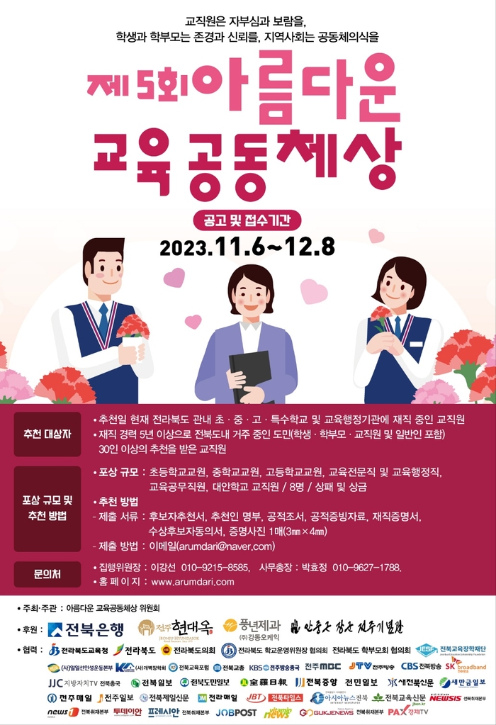 전북지역 학부모를 비롯해 각계각층에서 교육발전을 위해 힘쓰는 시민들로 구성된 ‘아름다운 교육공동체상 위원회’는 다음달 8일까지 제5회 수상 추천 대상자를 모집한다고 밝혔다.