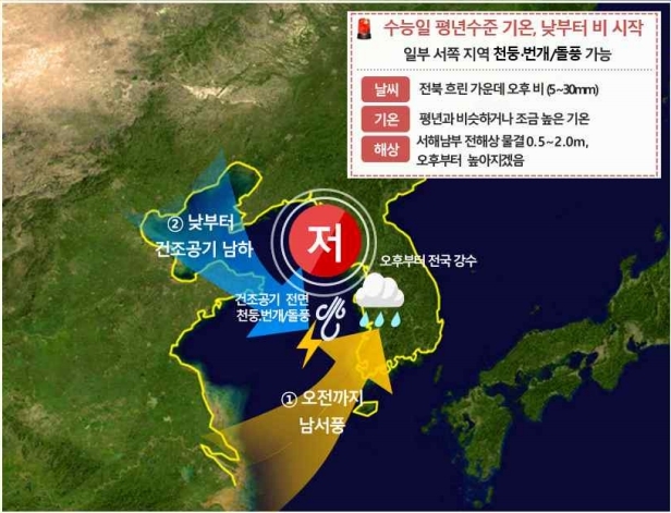 전주기상지청장에 따르면 "수능일 강한 추위(기온)는 나타나지 않을 것으로 내다봤지만, 낮 서해안부터 비(강수)가 시작되어 오후 전북 대부분 지역까지 확대된다"고 발표했다.