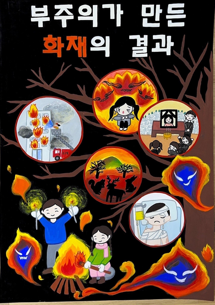이민서 학생은 “부주의로 생겨난 작은 실수가 씨앗이 되어, 화재라는 열매를 맺는다는 생각을 했습니다. 다양한 화재현장과 참혹한 결과를 보여줌으로써 경각심을 가질수 있도록 표현했습니다.”라고 작품을 설명했다.