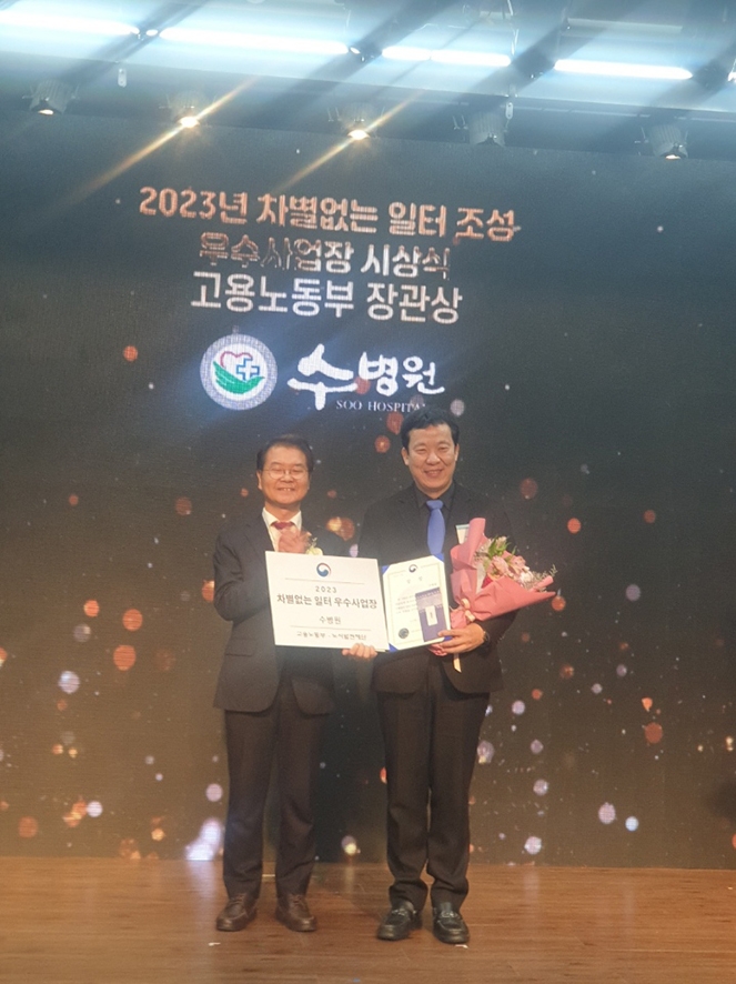 수병원은 '정규직과 비정규직의 차별 없는 근로조건 보호, 비정규직 127명 직원 100% 정규직 전환, 수평적 조직문화와 다양한 문화 프로그램 지원, 육아휴직제도가 시행하기 이전부터 약 80여 명의 남, 여 직원들이 출산과 육아휴직 실시, 휴직 후에도 다시 일하고 싶은 직장'으로 고용차별 예방 및 차별 없는 일터 개선 활동 성과를 인정받았다.
