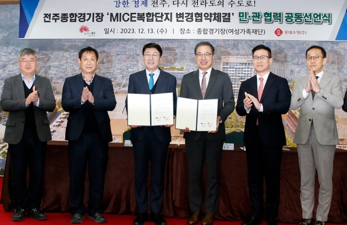 전주시가 민간 사업자인 롯데쇼핑(주)과 함께 오는 2028년까지 총 사업비 1조3백억원을 투자해 전주종합경기장 부지를 전주 경제의 심장부가 될 마이스산업 복합단지로 개발한다. 이에 따라 지난 2012년 협약체결 이후 10여년 동안 지지부진했던 전주종합경기장 부지개발사업이 본궤도에 오르게 됐다. 우범기 전주시장과 정준호 롯데쇼핑(주) 대표이사는 13일 오후 전주여성가족재단 대강당에서 ‘전주 종합경기장 MICE 복합단지 개발사업 변경협약 체결에 따른 민·관 협력 공동선언식’을 가졌다. 이번 선언은 시와 롯데쇼핑(주)이 최근 체결한 종합경기장 부지개발 사업시행 변경 협약의 연장선으로, 우 시장과 정 대표이사는 이날 전주종합경기장 MICE복합단지 개발사업의 성공적인 추진을 위한 협력선언문에 서명하면서 변경협약서의 성실한 이행을 약속했다. 시와 롯데쇼핑(주)이 체결한 사업시행 변경 협약의 주요 내용은 기존 ‘종합경기장 이전사업’에서 ‘종합경기장 마이스(MICE) 복합단지 개발 사업’으로 방향을 튼 것이 핵심이다. 이를 위해 공공시설은 기존 제1종 육상경기장과 야구장에서 전시컨벤션센터로 변경하고 수익시설은 호텔과 백화점, 쇼핑몰에서 쇼핑몰을 제외한 호텔과 백화점으로 바뀌었다. 또한 사업방식도 당초 종합경기장 전체 부지(12만715㎡) 중 53%(6만3천786㎡)를 민간사업자에 양여하는 ‘기부 대 양여’ 방식에서 종합경기장 전체 부지의 27%(3만3000㎡)를 롯데쇼핑에 변제하는 ‘대물 변제’ 방식으로 정했다. 특히 이번 변경협약서에는 사업기간(협약 체결일로부터 66개월)과 착공기한(협약체결일로부터 30개월)이 명시돼 실행력을 담보할 수 있게 됐다. 또 총 사업비는 당초 9백50억원에서 3천억원으로 증가했다. 우 시장은 이어 종합경기장에서 진행된 현장 브리핑을 통해 오는 2028년까지 전주종합경기장 부지 일원에 국비와 민간투자비 등 총사업비 1조3백억원을 투입하는 ‘전주 종합경기장 MICE복합단지 개발계획’의 비전을 제시했다. 구체적으로 시는 종합경기장 부지에 △글로벌 MICE산업 핵심 거점 공간 △새로운 문화예술 거점 공간 △메타버스 융복합 청년 스타트업 공간 △시민을 위한 도심 속 열린 광장 등 4가지 비전의 총 6개 전시·회의·문화·예술·교육·창업시설을 집적화할 계획이다. 시는 사업이 완료되면 종합경기장 일대가 전북도 마이스 산업을 이끌 핵심 거점 공간이자 전북도민 누구나 손쉽게 문화를 향유하고 교류할 수 있는 복합문화공간으로 자리매김할 것으로 기대하고 있다. 정준호 롯데쇼핑(주) 대표이사는 이날 “마이스 복합단지가 전주와 전북지역의 랜드마크로서 전주시의 발전과 경제 활성화를 선도하고 당사는 복합몰 형태의 새로운 쇼핑․여가․문화의 공간을 조성하겠다”고 밝혔다. 우범기 시장은 “종합경기장 부지가 마이스산업 거점으로 탈바꿈되면 기업 유치와 지역 특화산업 발전을 위한 고부가가치 지식서비스산업 거점 공간으로서의 몫을 다 할 것이다”고 강조했다. /김영태 기자