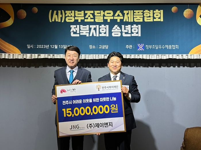 ㈜제이앤지는 (사)정부조달우수제품협회 전북지회 송년회를 통해 전주시 어려운 이웃들을 위해 사용해 달라며 전주시복지재단에 후원금 1500만 원을 전달했다.