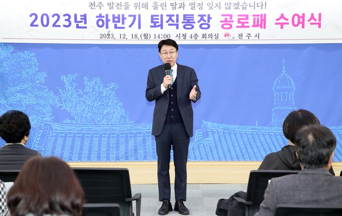 전주시는 ‘2023년 하반기 임기만료 퇴직통장 공로패 수여식’을 18일 시청회의실을 통해 지난 7월부터 12월까지 통장 임기가 만료돼 퇴직한 95명(완산구 56명, 덕진구 39명)에게 공로패를 수여했다.