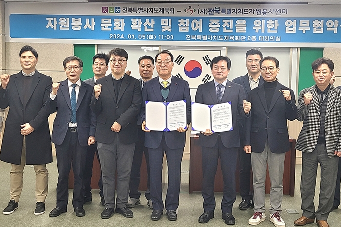 (사)전북특별자치도자원봉사센터(이사장 고영호)는 전북특별자치도체육회(회장 정강선)와 5일 자원봉사문화 확산을 위한 업무협약을 맺고 상호신뢰와 협력을 바탕으로 도내 자원봉사 활성화에 적극 협력할 것을 다짐했다. 이에 따라 체육회는 임직원들과 체육인들의 사회공헌활동 참여와 인적·물적 인프라와 협력사업을, 자원봉사센터는 체육회와 함께 자원봉사 프로그램 개발 및 수요처 연계지원에 적극 나설 계획이다. 정강선 회장은 “도민들의 스포츠 복지 향상을 위해서는 자원봉사 협력이 중요하며, 양 기관의 풍부한 경험과 전문성을 토대로 도민을 위한 스포츠 서비스를 펼치겠다”고 말했다. 고영호 이사장은 “이번 협약을 통해 지역사회발전과 도민이 스포츠를 즐기고 건강한 전북특별자치도 구현에 힘을 기울이며 자원봉사와 체육진흥을 위한 상호 협력강화에 양 기관 모두 노력해 나가자고”말했다.