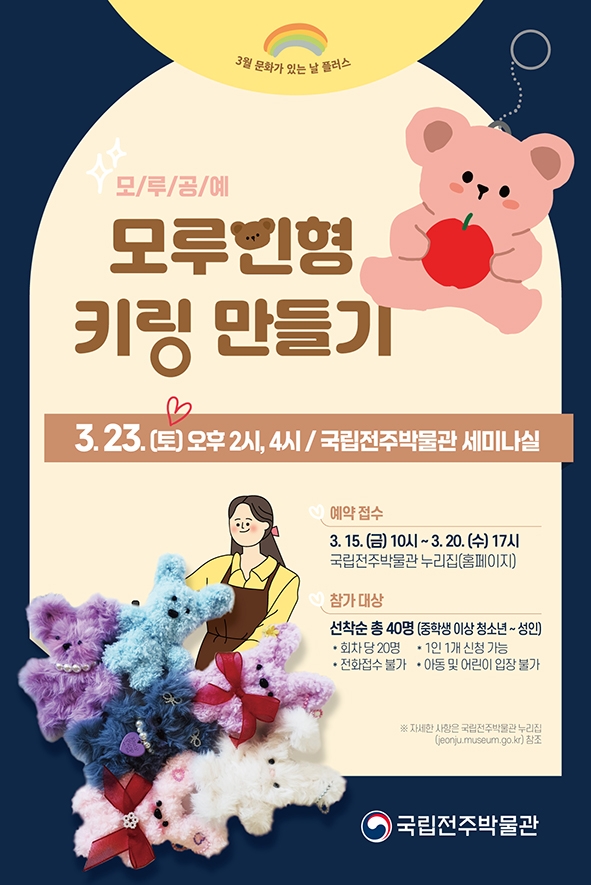 국립전주박물관(관장 박경도)은 3월 문화가 있는 날 플러스 문화행사로 무료 ‘모루인형 키링만들기’을 준비했다고 13일 밝혔다.