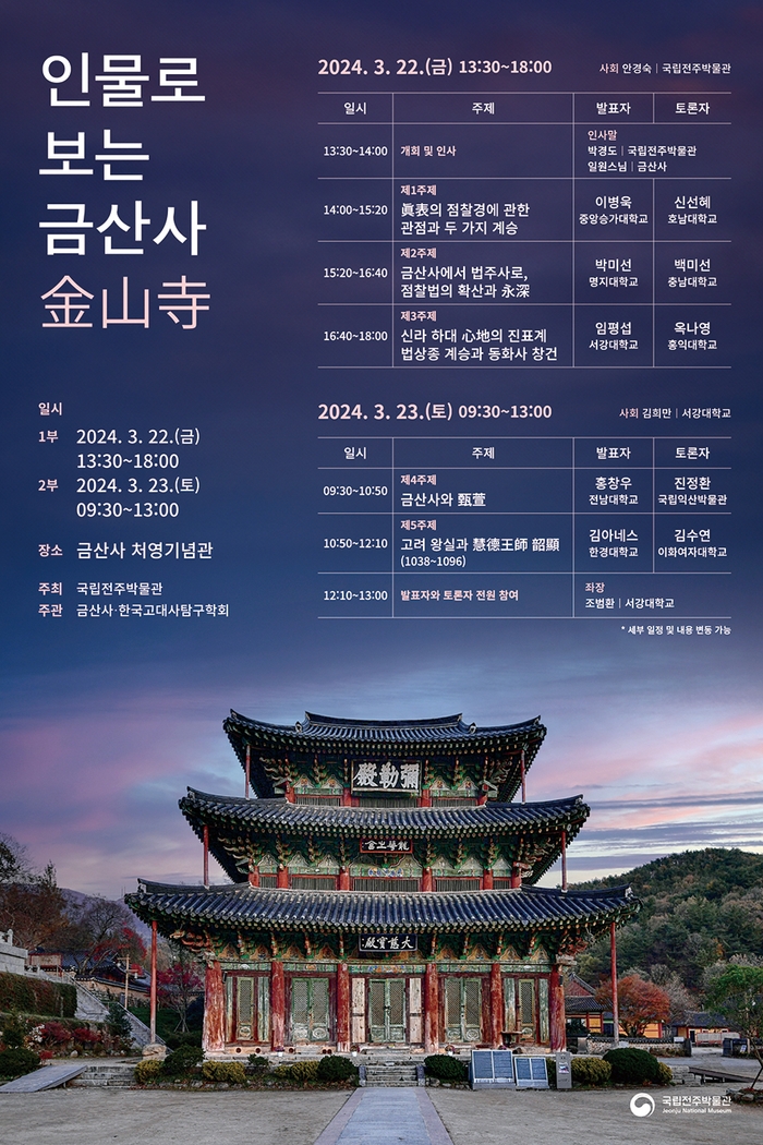 국립전주박물관(관장 박경도)은 22일 ~ 23일 이틀에 걸쳐 ‘인물로 보는 금산사’ 학술대회를 금산사 처영기념관에서 개최한다.