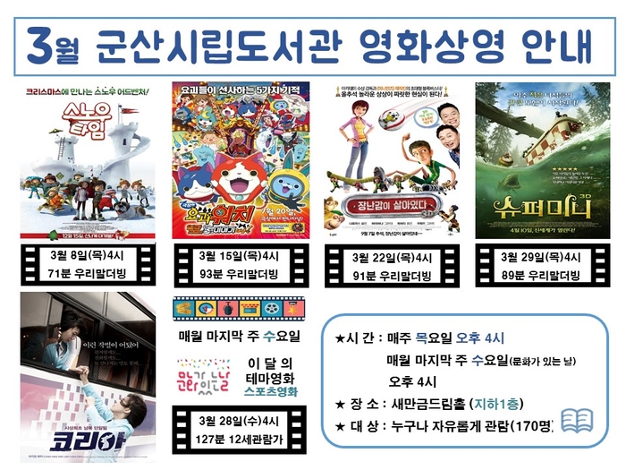 3월에는 오는 ▲8일 ‘스노우 타임’을 시작으로 ▲15일 ‘요괴워치 : 염라대왕의 5개의 이야기다냥!’ ▲22일 ‘장난감이 살아있다’ ▲29일 ‘슈퍼미니’를 만날 수 있다.