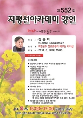 '제552회 김제 지평선아카데미'는 한신대학교 정조교양대학 김준혁 교수를 초청해 오는 22일 오후 3시 김제시청 지하대강당에서 ‘위민군주 정조로부터 배우는 리더십’이라는 주제로 강연을 진행한다.