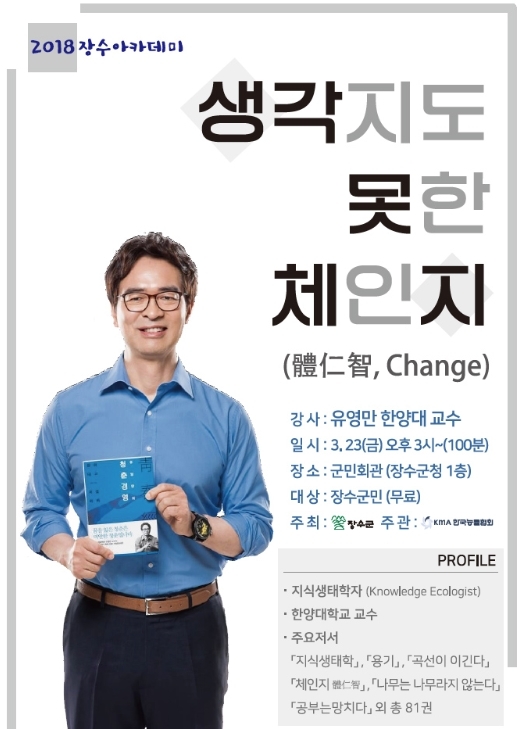 이번 장수아카데미는 오는 23일 장수군민회관에서 유영만 강사를 초청, '생각지도 못한 체인지(體仁智)'라는 주제로 '체험해서(體), 느끼고 공감할 때(仁), 비로소 탄생하는 진짜 지혜(智)이고 그런 지혜로 체인지를 일으킬 수 있다'의 내용으로 특강을 진행한다.