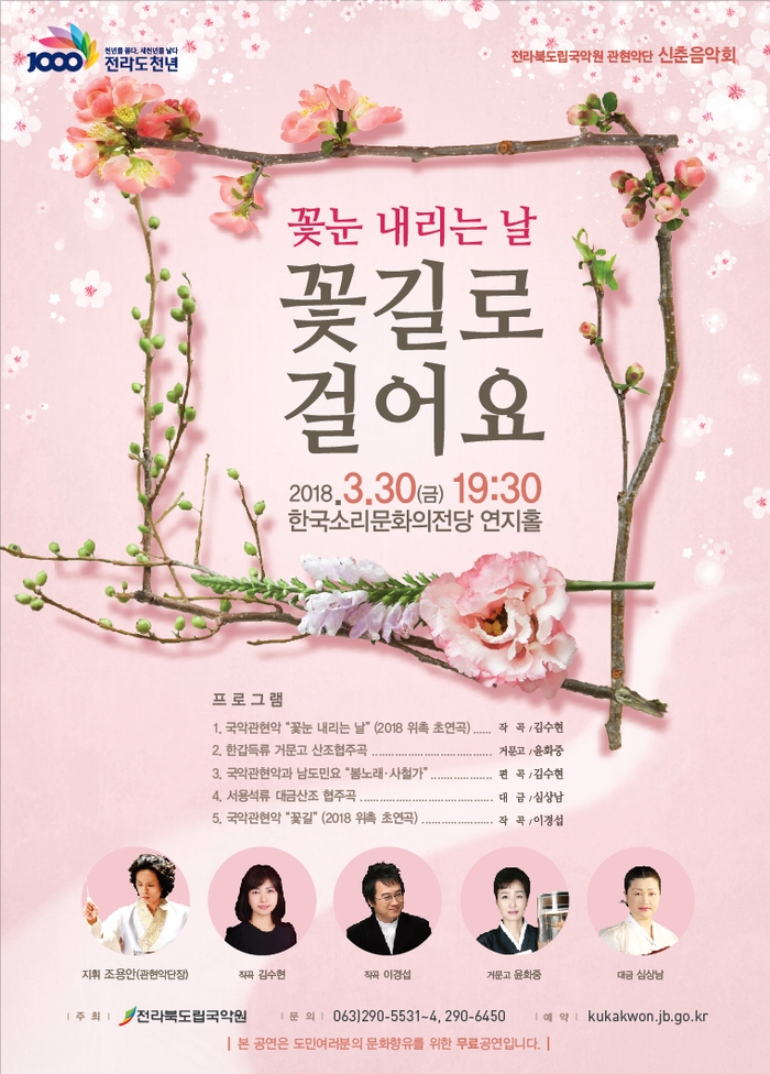 전라북도립국악원(원장 이태근) 관현악단(단장 조용안)은 "2018 신춘음악회 '꽃눈 내리는 날, 꽃길로 걸어요'가 오는 30일 오후 7시 30분, 한국소리문화의전당 연지홀에서 열린다"고 22일 밝혔다. 공연은 무료다.