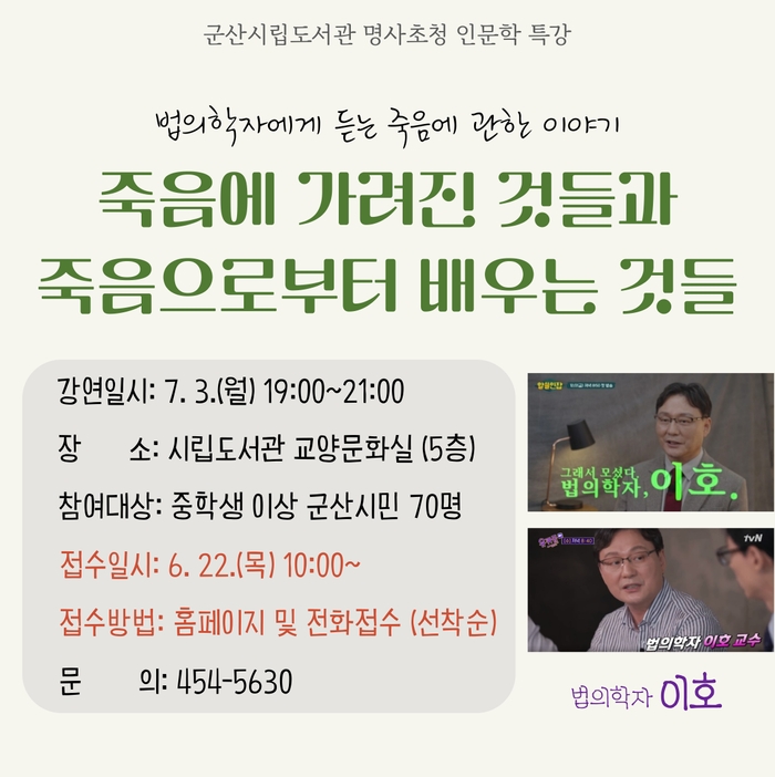 이번 특강은 중학생 이상 성인이라면 누구나 참여 가능하며, 시립도서관 홈페이지(http://lib.gunsan.go.kr) 및 전화로, 오는 22일 법의학, 7월 3일 미술강연 사전접수를 시작해 선착순 모집 예정이다.