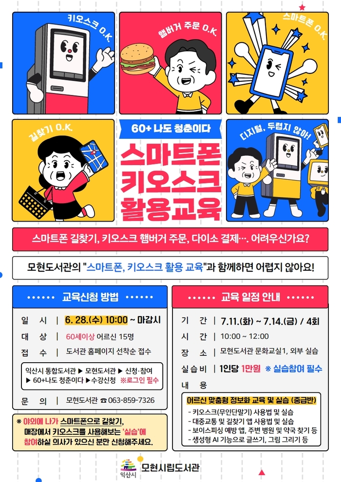 60세 이상 지역 어르신을 대상으로‘60+ 나도 청춘이다, 스마트폰, 키오스크 활용 교육’이 다음 달 11일부터 14일까지 4일간 모현도서관에서 진행된다.