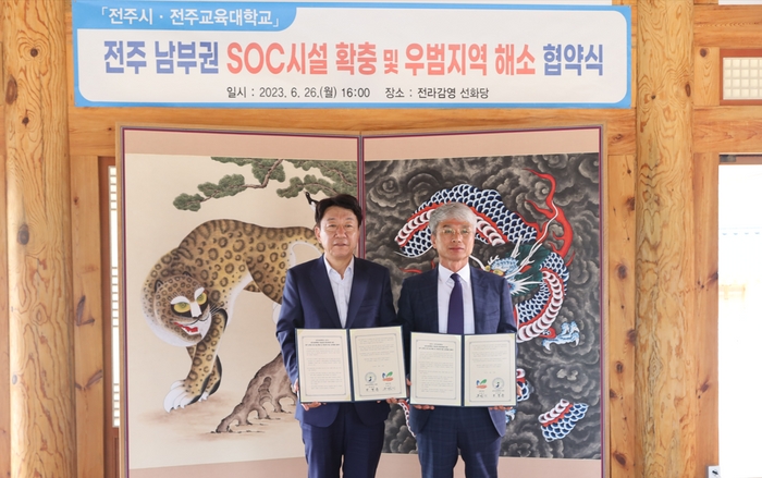 전주교대와 전주시가 지난 26일 오후 4시 전라감영 선화당에서 전주 남부권 SOC시설의 확충 및 우범지역 해소를 위한 업무협약을 추진했다.