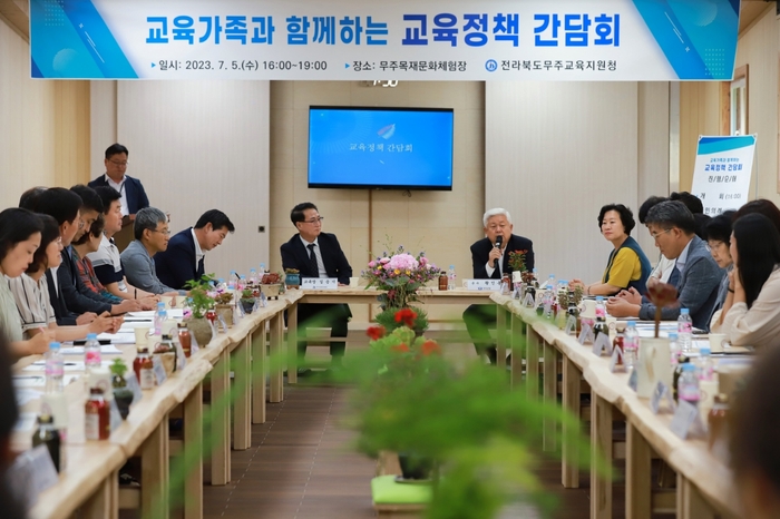 이번 간담회에는 황인홍 무주군수, 이해양 무주군의회 의장, 윤정훈 전라북도의원, 단위학교 학부모회장 등 교육가족 60여 명이 참석하여 전북교육 정책 방향과 무주교육 주요 현안에 대해 서로 이해하고 소통하는 시간을 가졌다.