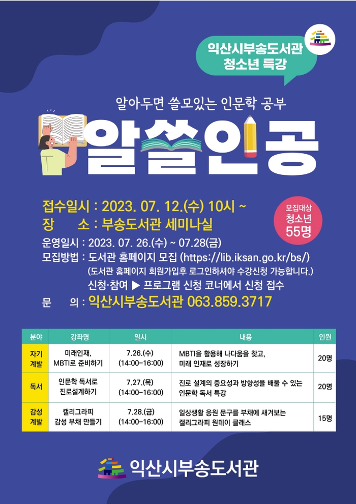 익산부송도서관은 방학을 맞은 청소년을 대상으로 '알쓸인공-알아두면 쓸모있는 인문학 공부’ 특강을 개최한다.
