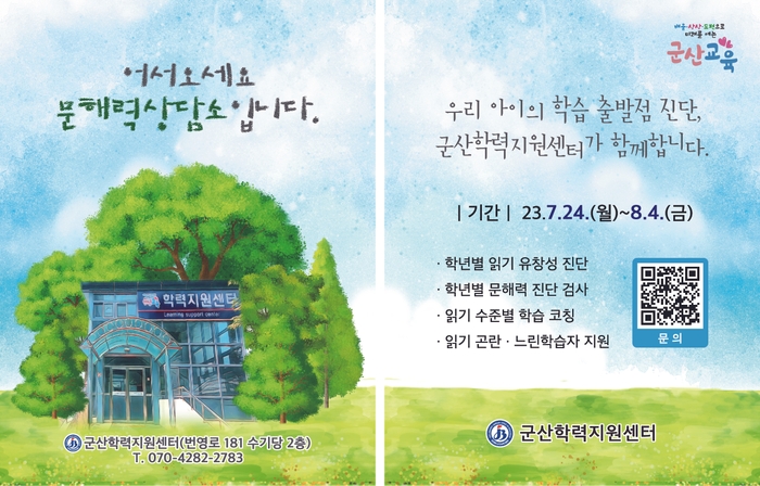 군산교육지원청(교육장 박경희) 군산학력지원센터에서는 7월 24일(월)부터 8월 4일(금)까지 2주간 [2023 군산학력지원센터 방학 중 집중 상담주간]을 운영한다.