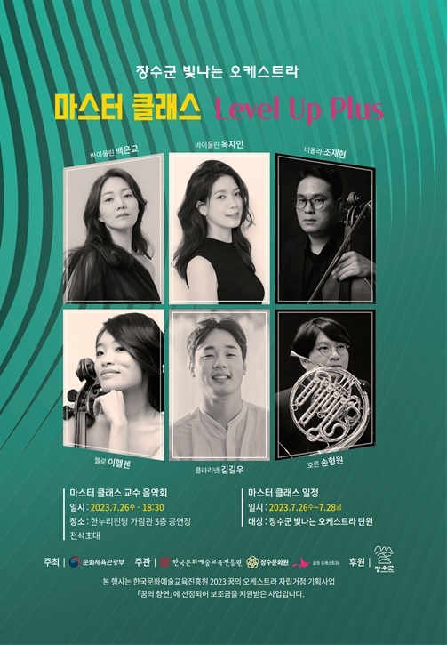 한병태 장수문화원장은 “마스터 클래스 교육과 수준 높은 음악회를 통해 단원들은 다면적으로 성장할 수 있는 계기가 되고, 지역주민들에게는 다양한 음악을 관람하면서 장마와 무더위로 지친 마음을 치유하며 함께 하는 시간이 되길 바란다”라고 말했다.
