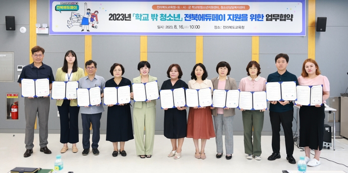 전북교육청과 도내 9개 학교밖청소년지원센터, 5개 청소년상담복지센터는 이날 교육청 창조나래관 회의실에서 ‘학교 밖 청소년 전북에듀페이(학습지원비) 지원사업 추진을 위한 업무협약’을 체결했다.