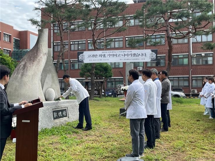 수의대 교수와 학생 100여 명이 참석한 가운데 열린 이날 수혼제에서는 박상열 학장의 추도사와 김재훈 학생회장의 추모문 낭독, 그리고 헌화 등이 진행됐다.