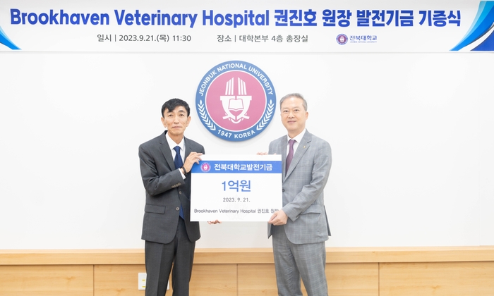 전북대학교(총장 양오봉) 수의학과를 졸업한 권진호 원장(수의대 37회 졸업, 미국 펜실베니아주 브룩헤이븐 동물병원장)이 후학 양성에 써달라며 발전기금 1억 원을 기부했다.