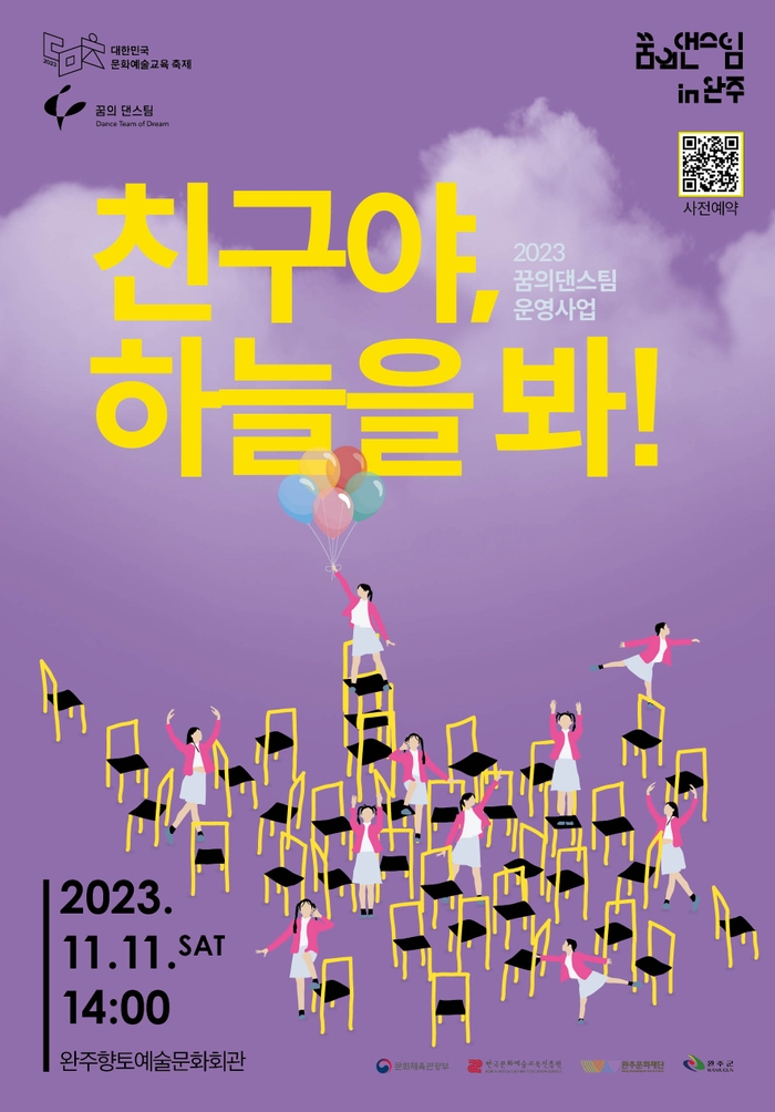 이 공연의 작품명은 “친구야, 하늘을 봐”로 완주군의 초·중·고 생들이 펼치는 무대이다. 다양한 연령대의 친구들이 각자의 방식으로 표현하는 춤에 대한 도전을 볼 수 있으며 공연 뿐 아니라 그동안 진행되었던 다양한 에피소드를 공유하는 자리도 마련하여 더욱 뜻깊은 자리가 될 예정이다.