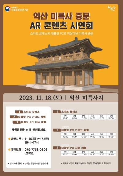 이번 시연회는 국립문화재연구원이 증강현실로 복원한 미륵사 중문 콘텐츠 체험 서비스를 2024년부터 익산시와 함께 본격 운영하기에 앞서, 국민들에게 사전체험 기회를 제공하고, 사용 소감을 청취하고자 마련된다.