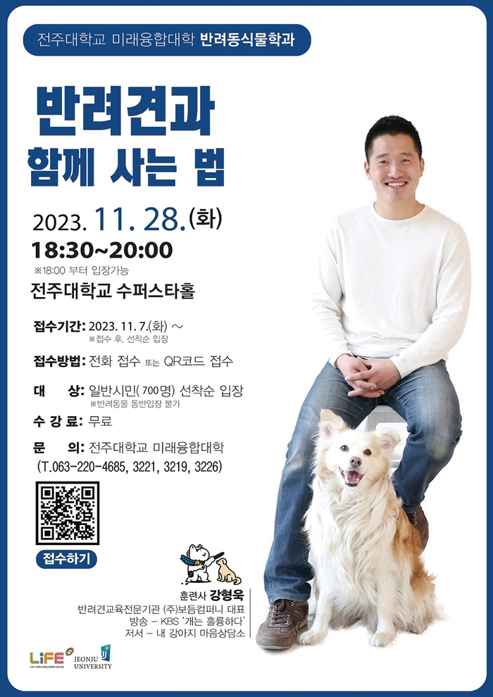 전주대 미래융합대학은 오는 28일 오후 6시30분에 전주대 수퍼스타홀에서 강형욱 훈련사와 함께하는 '반려견과 함께 사는 법' 특강을 개최한다.