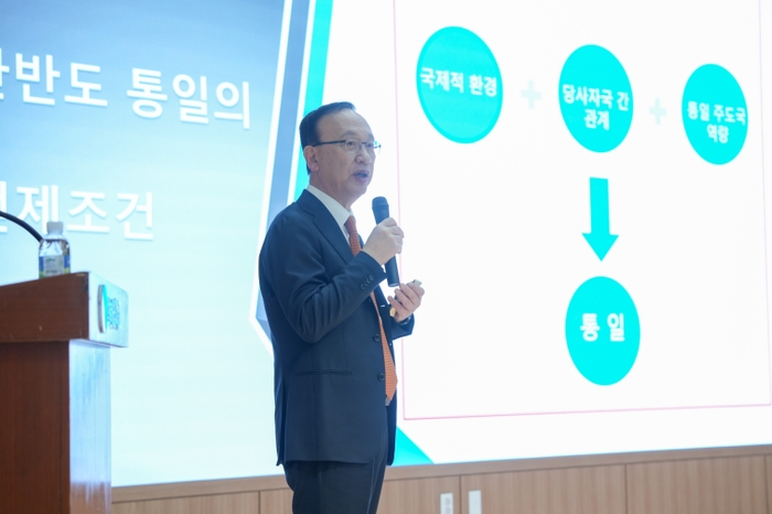 현 전 장관은 이날 특강을 통해 오랜 시간이 걸리더라도 통일을 반드시 이뤄내야 하며 국제적 조건, 당사국간 관계, 통일 주도국의 역량 3가지 모두 충족했을 때 통일을 이뤄낼 수 있다고 강조했다.