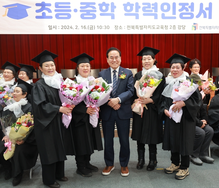전북특별자치도교육청(교육감 서거석, 이하 전북교육청)은 16일 2층 강당에서 ‘2023학년도 문해교육 프로그램 초등·중학 학력인정서 수여식’을 개최했다.