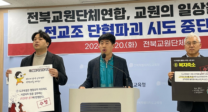 전북지역 4개 교원단체는 20일 기자회견을 열고 전북특별자치도교육청이 최근 전국교직원노동조합 전북지부에 보낸 단체협약 갱신요구안에 반발했다.