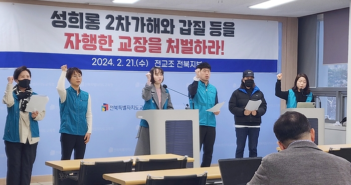 전교조 전북지부는 21일 전북특별자치도교육청에서 기자회견을 열고 "갑질과 성희롱 피해 교사에 대한 2차 가해행위를 저지른 A교장을 처벌하라"고 주장했다.