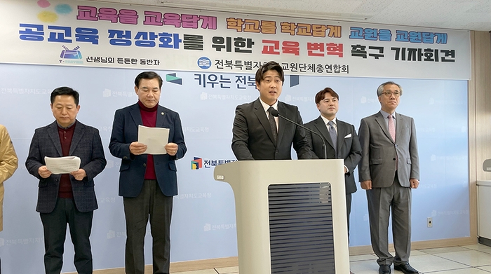 전북교총은 "이에 7대 교육변혁 과제를 제시했다"며 "교원의 전문성을 발휘할 수 있도록 교사가 가르침에 집중할 수 있는 환경을 조성해 사회 모두가 공교육을 신뢰할 수 있는 여건을 조성하는데 교육 당국과 우리 사회의 관심과 협조를 부탁한다"고 요청했다.