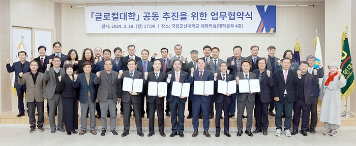 국립군산대학교(총장 이장호. 주관대학), 전주대학교(총장 박진배), 호원대학교(총장 강희성)와 전북특별자치도(도지사 김관영), 전북특별자치도교육청(교육감 서거석), 군산시(시장 강임준)는 18일 국립군산대학교 본부 대회의실에서 글로컬대학 공동 추진을 위한 업무협약을 체결했다.